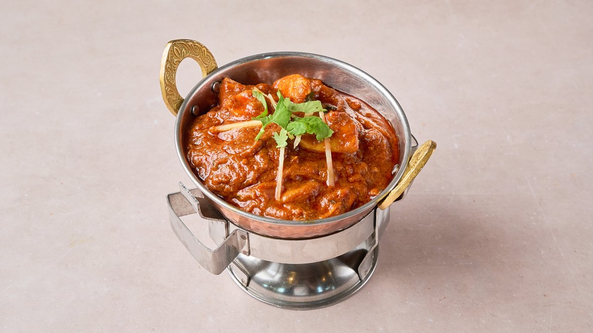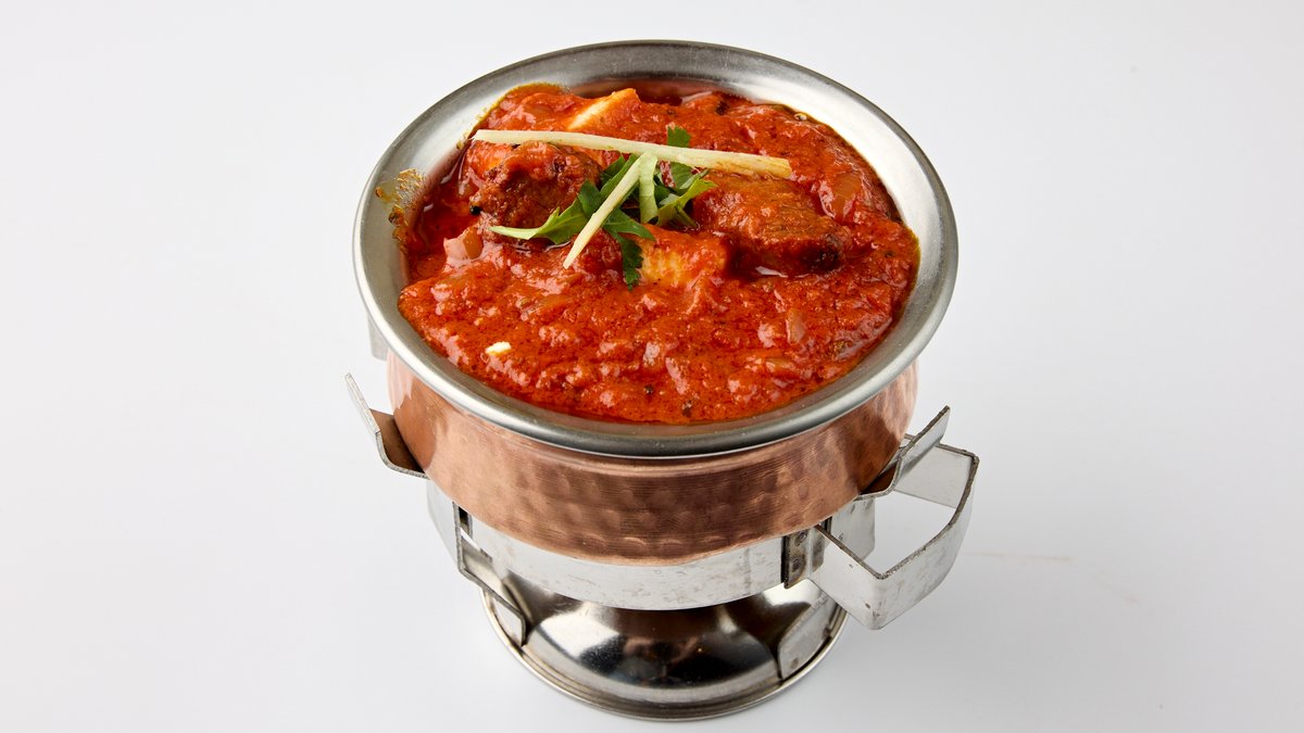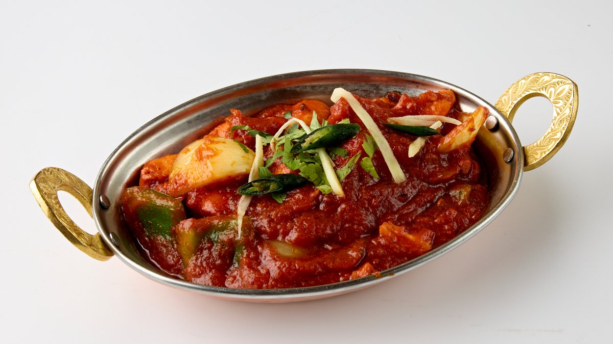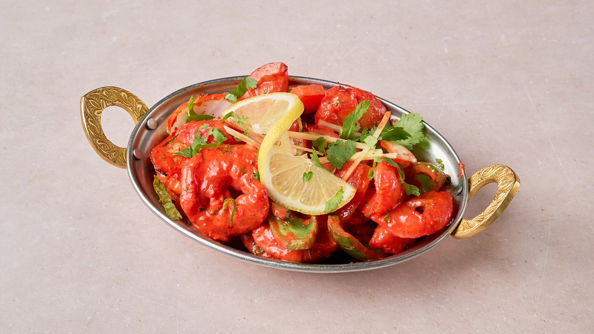 Yrtti-jogurttimarinoituja ja tandoori-uunissa grillattuja lampaan sisäfilee paloja, kanan rintafileepaloja ja jättikatkarapuja paprika-, chili-, tomaatti-, inkivääri-, valkosipuli- ja masalakastikkeessa Herb and yoghurt marinated tandoor oven grilled lamb, chicken and king prawns in capsicum, chili, tomato, ginger, garlic and masala sauce