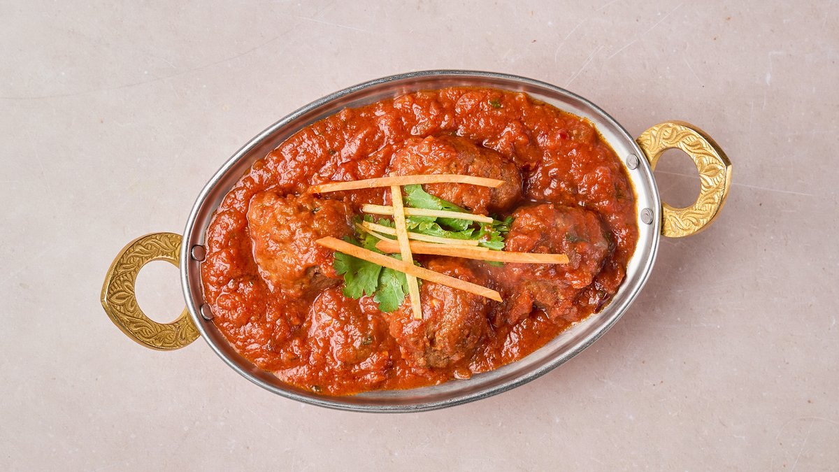 Kuminalla ja korianterilla maustettuja lampaanjauheliha pyöryköitä tomaatti-, sipuli-, inkivääri- ja masalakastikkeessa Minced lamb meat balls seasoned with cumin and coriander in tomato, onion, ginger & masala sauce