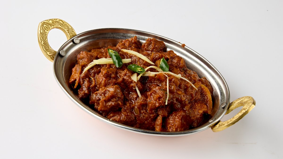 Haudutettuja lampaan paloja, perunaa ja tomaattia voimakkaasti maustetussa chili-, sipuli-, inkivääri-, valkosipuli- ja vindalookastikkeessa Stewed lamb pieces, potato & tomato in spicy chili, onion, ginger, garlic and vindaloo sauce