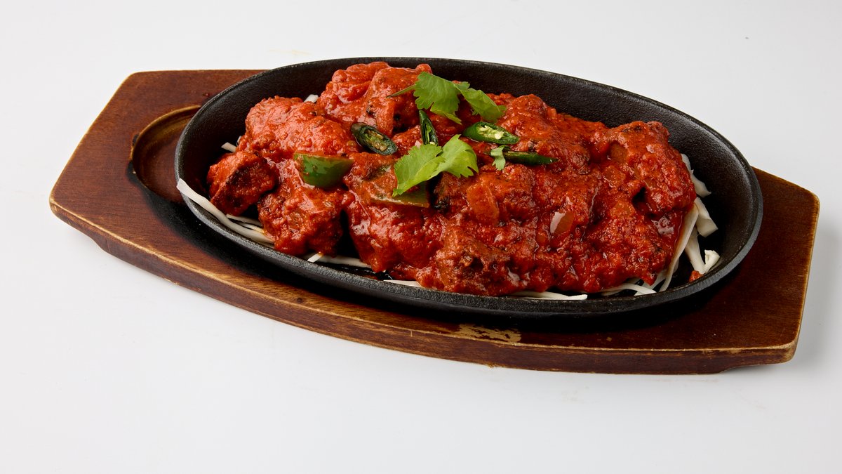 Yrtti-jogurttimarinoituja ja tandoorissa grillattuja lampaan sisäfilee paloja, ruskistettua paprikaa, tomaattia ja tuorejuustoa tulisesti maustetussa chili-, valkosipuli-, inkivääri-,kookos- ja sipulikastikkeessa Herb and yoghurt marinated and tandoor oven grilled lamb pieces; sautéed capsicum, tomatoes and cottage cheese in hot & spicy chili, garlic, ginger, coconut and onion sauce