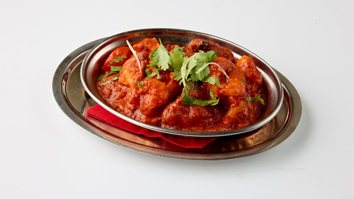 Yrtti-jogurttimarinoituja ja tandoori-uunissa grillattuja kanafilee ja lampaan sisäfilee paloja,paprikaa ja tuoretta tomaattia keskivahvassa inkivääri-, kookos- ja chilikastikkeessa Tandoor oven grilled herb yoghurt marinated chicken fillet and lamb tenderloin pieces with capsicum and fresh tomatoes in medium spicy ginger, coconut and chili sauce