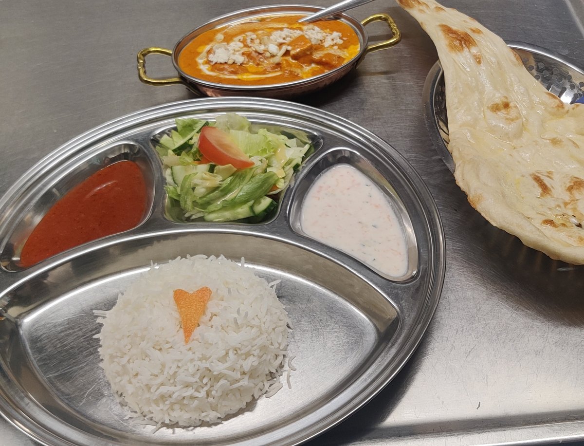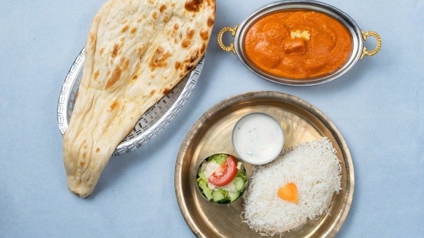 Cottage cheese in tomato butter cream sauce including rice and raita