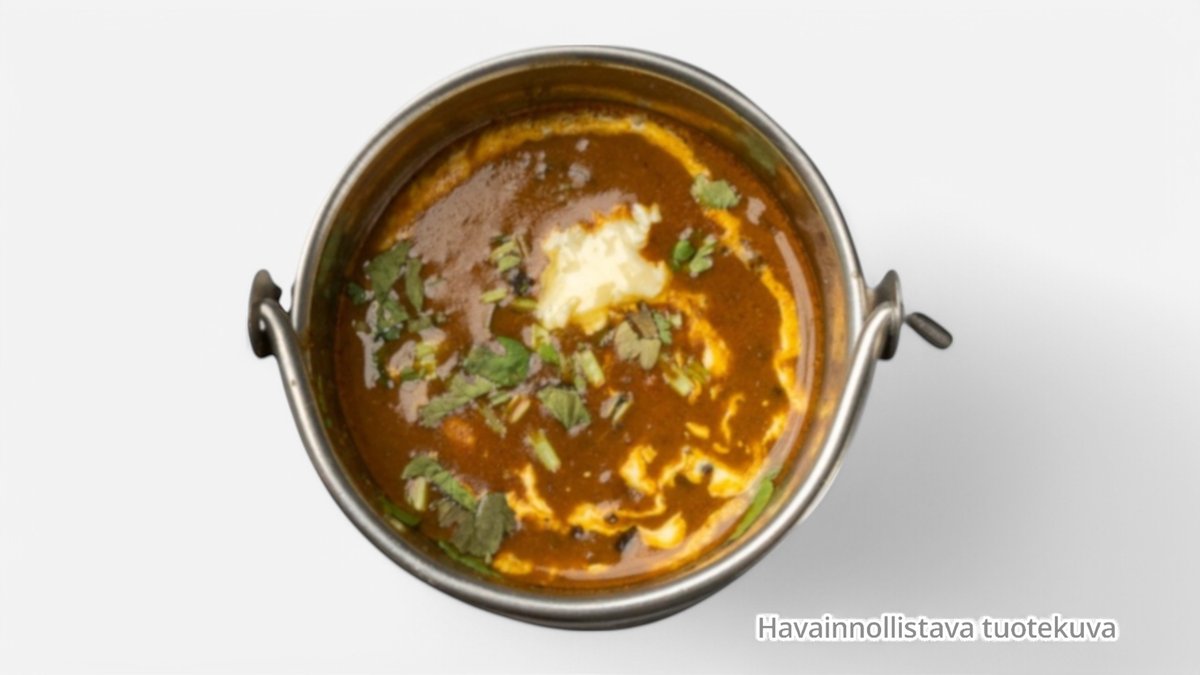 Lampaan jaulelihapyöryköitä, inkivääriä, valkosipulia, soijakastikketta, kuminaa ja tuore korianteria masala-currykastikkeessa. Lamb meatballs, ginger, garlic, soya sauce and fresh coriander in masala curry sauce.