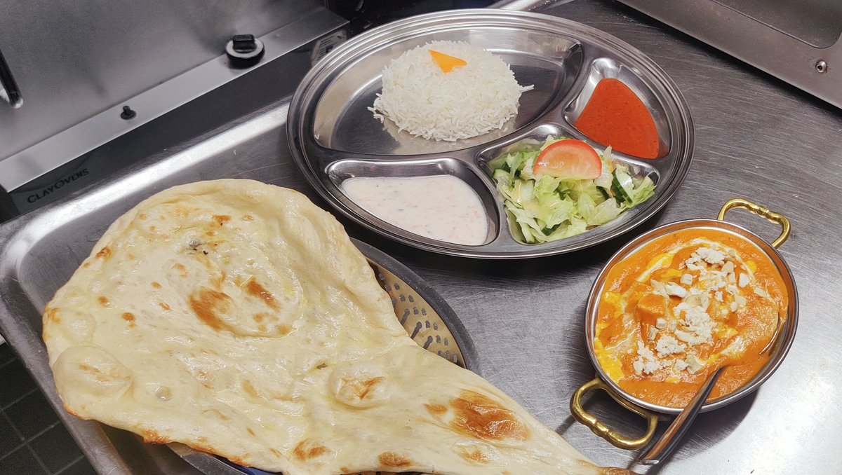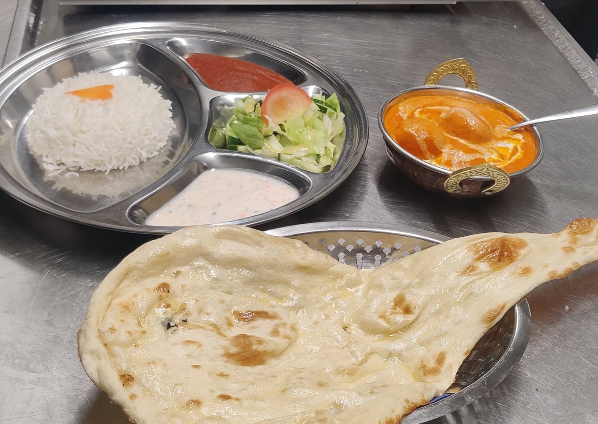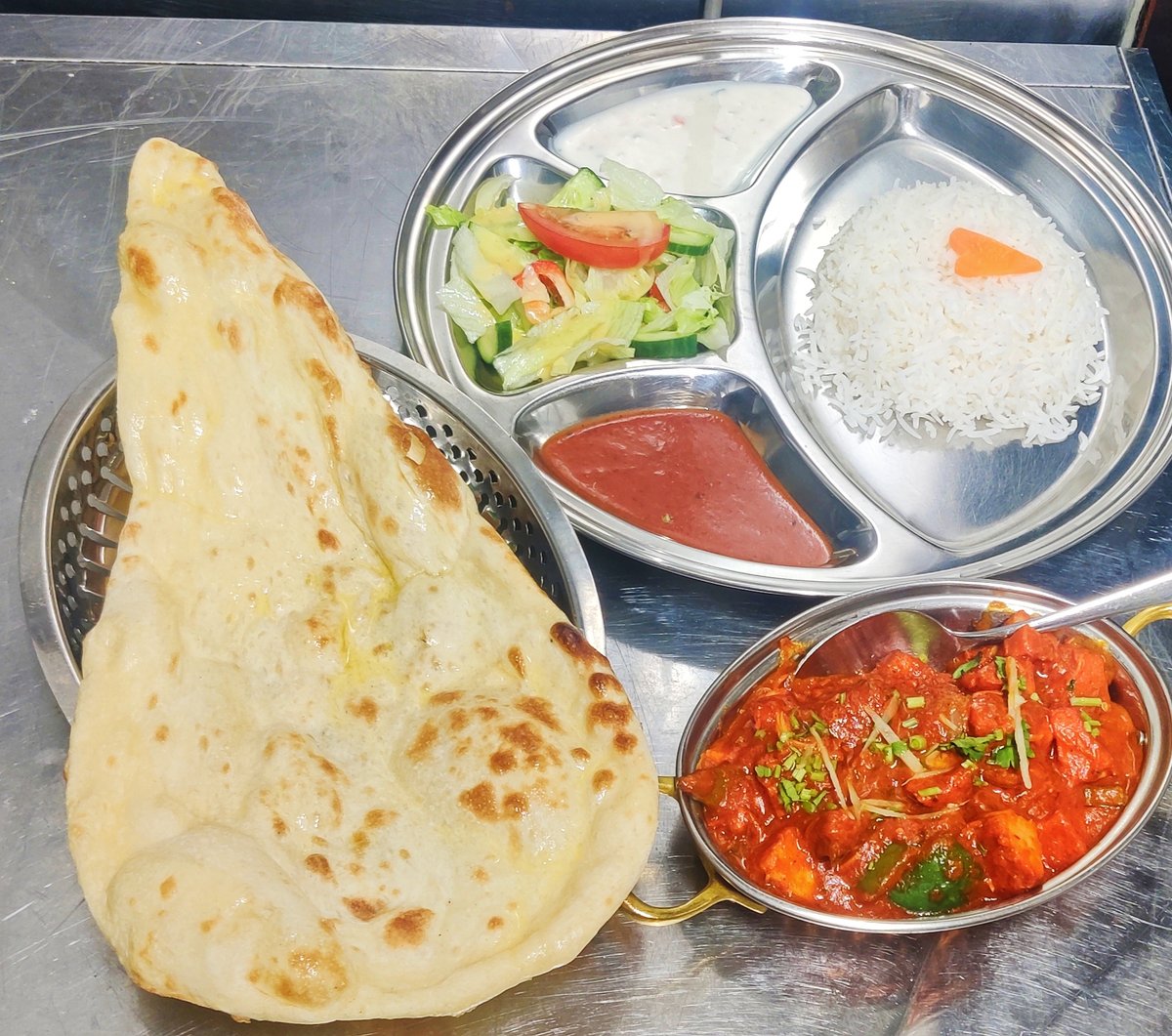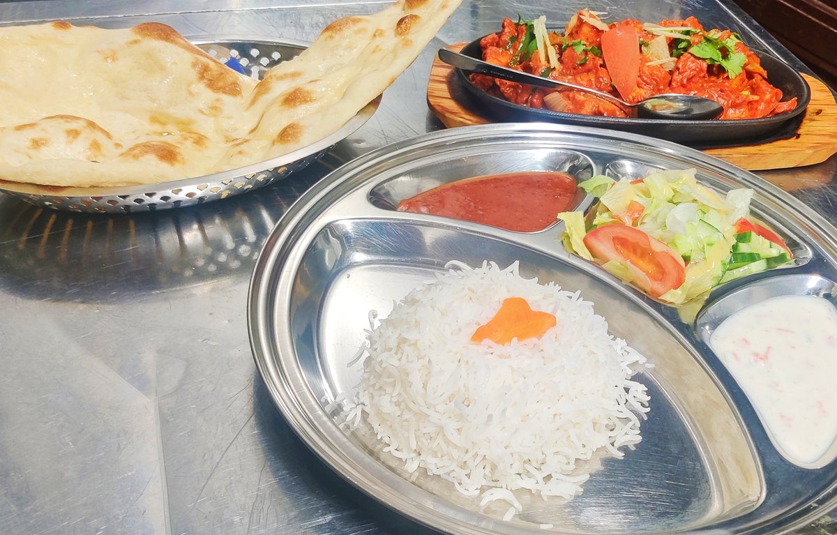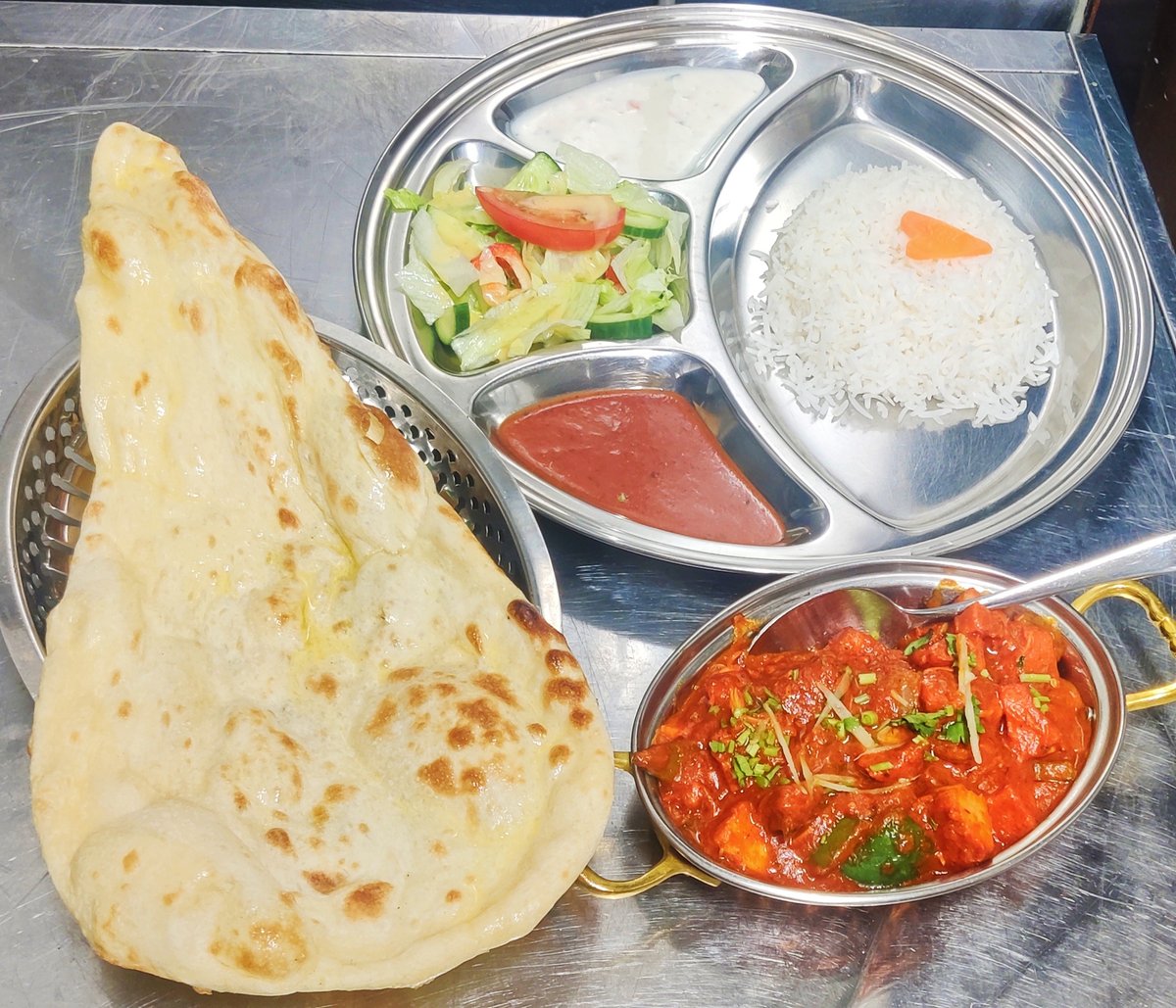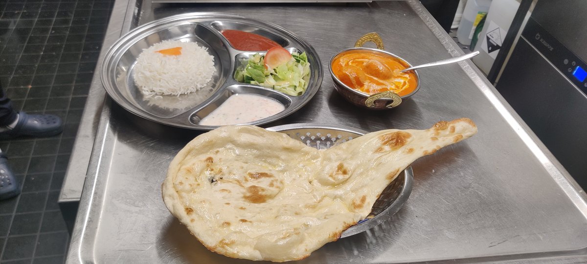 Tandoori merinate chicken in masala sauce including rice and naan bread, tomatoes mint sauce .