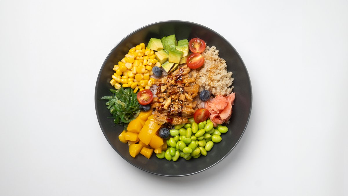 Tofua, edamame-papuja, maissia, kevätsipulia, paistettua sipulia, seesaminsiemeniä, kvinoaa, merilevää, avokadoa ja keltaista persikkaa.