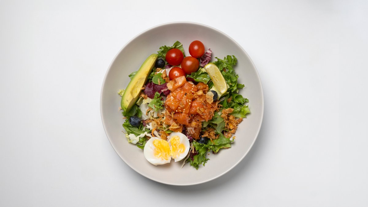 Raakaa lohta, raikasta salaattisekoitusta, kevätsipulia, keitetty kananmuna ja avokadoa.