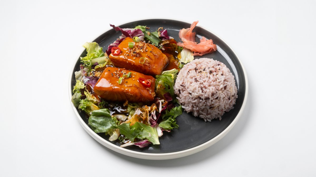 Lohta teriyaki-kastikkeessa, seesaminsiemeniä ja raikasta salaattisekoitusta