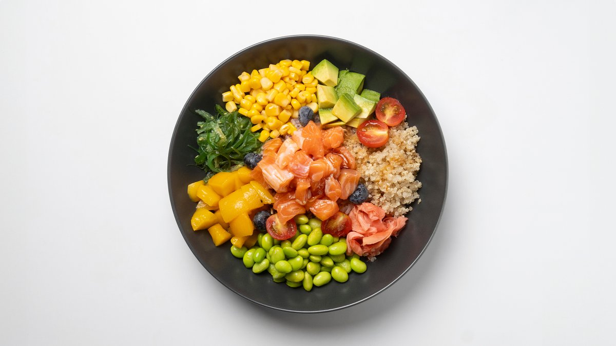 Raakaa lohta, edamame-papuja, maissia, kevätsipulia, paistettua sipulia, seesaminsiemeniä, kvinoaa, merilevää, avokadoa ja keltaista persikkaa.