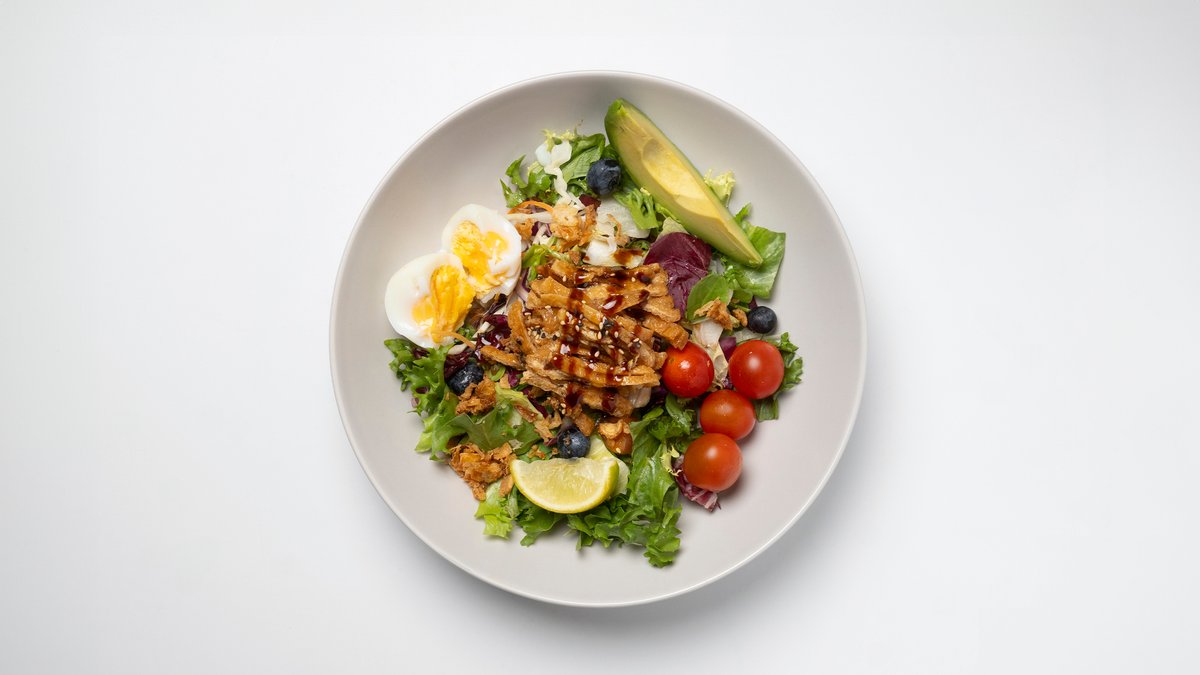 Tofua, raikasta salaattisekoitusta, kevätsipulia, keitetty kananmuna ja avokadoa.