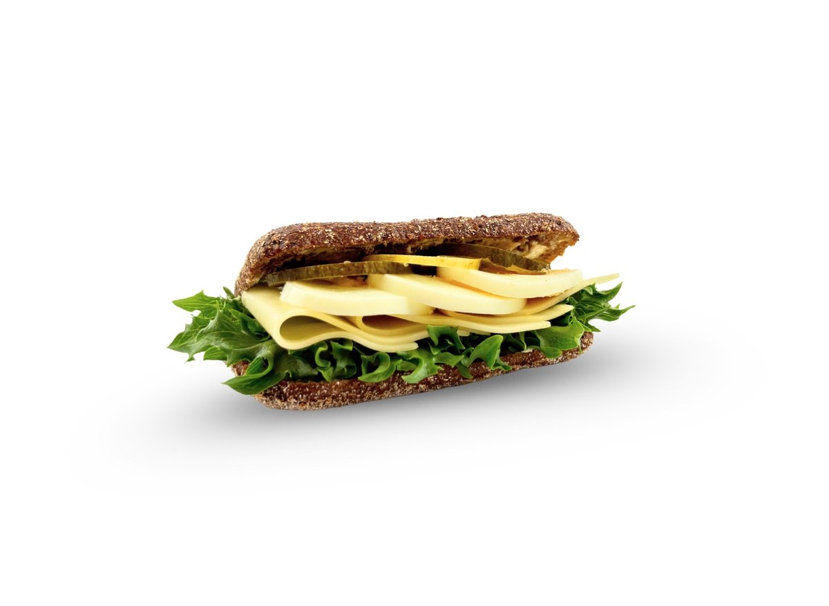 6-viljan patongin välissä goudajuustoa, kurkkua, tomaattia, salaattia sekä oivariinia.