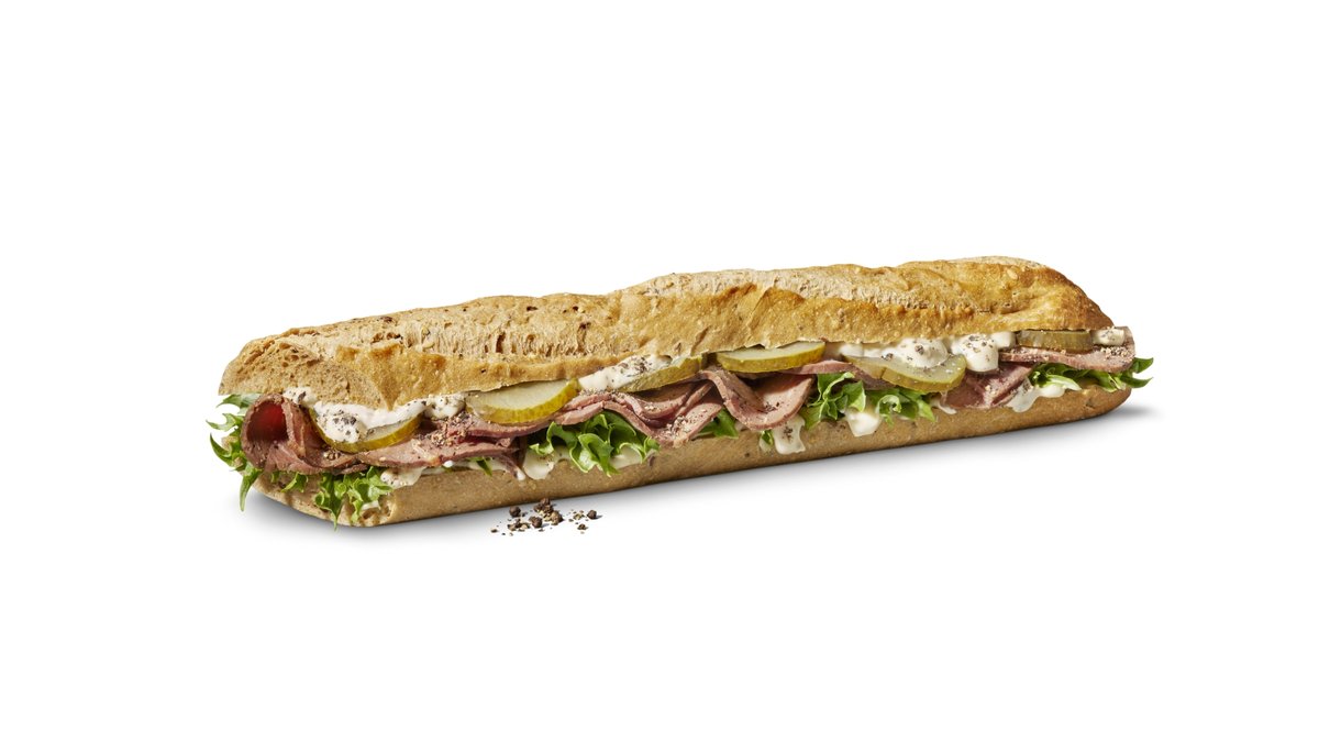 Picnic-klassikko! Rapeassa 6-viljan patongissa paahtopaistia (Suomi), Picnic-remouladekastiketta, maustekurkkua sekä salaattia.