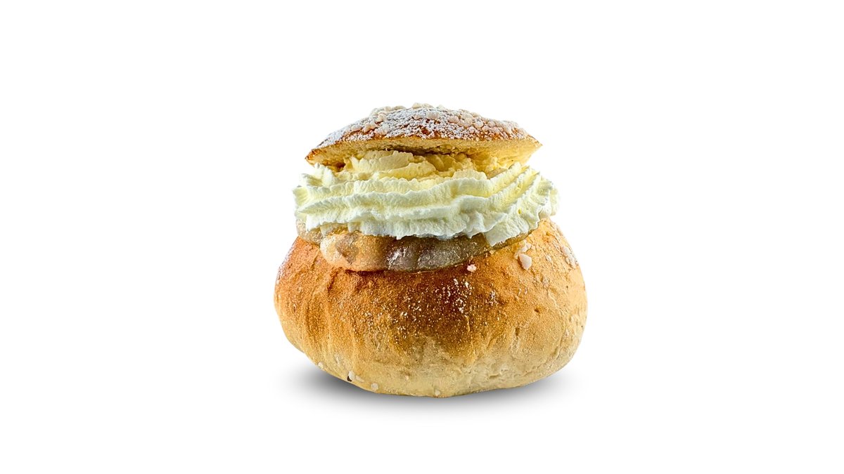 Ihanan pehmeä pulla täyteläisellä kermalla sekä herkullisella mantelimassalla. Pulla viimeistellään tomusokerilla.