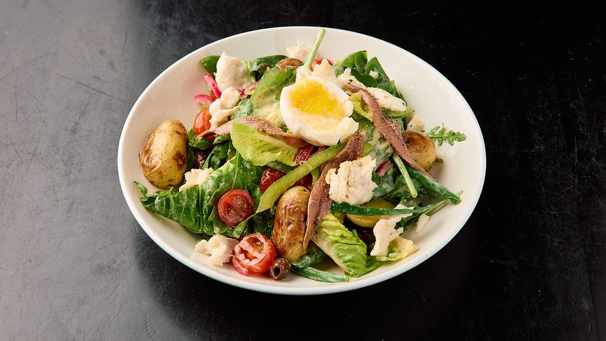 Marinoitu kotimainen ahven, pinaatti, peruna, vihreä papu, kirsikkatomaatti, marinoitu punasipuli, taggiasca-oliivi, anjovis, kananmuna, dijon-vinaigrette