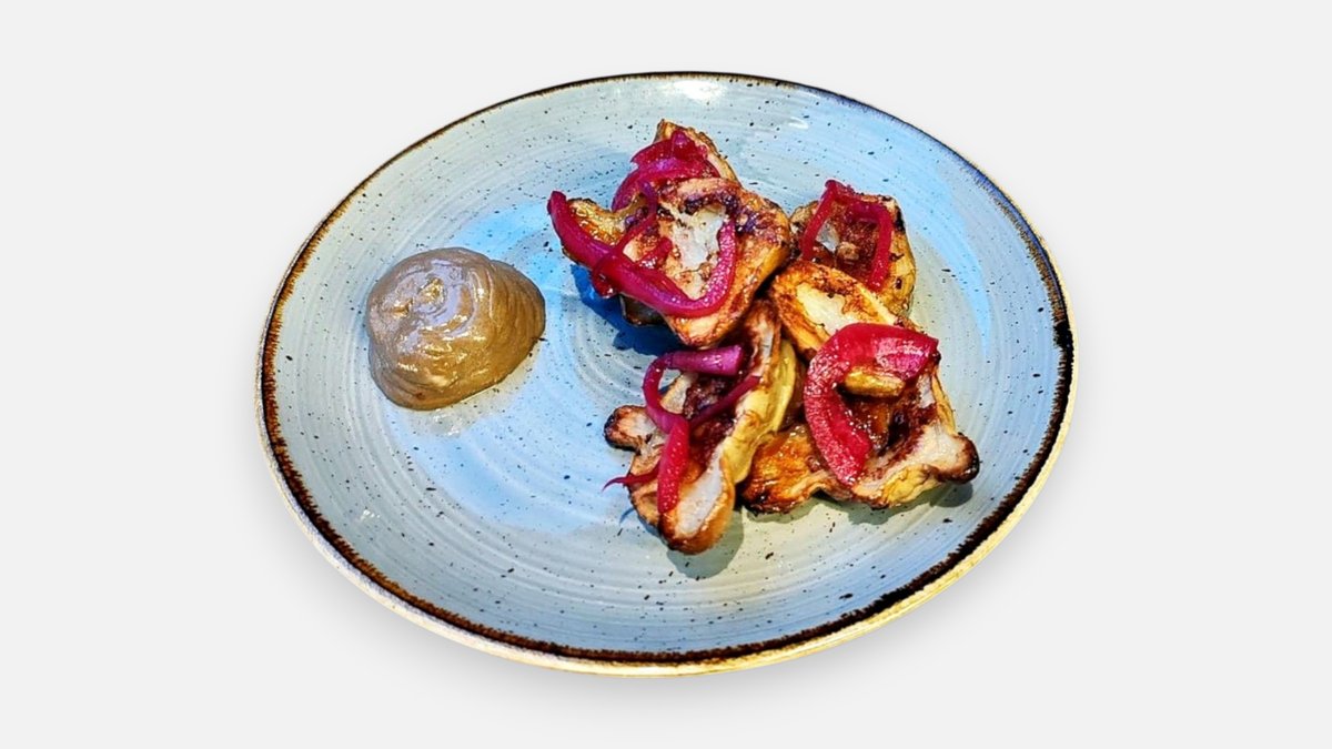 Paahdettua maa-artisokkaa, mustavalkosipuli mascarponea, pikkelöityä punasipulia
