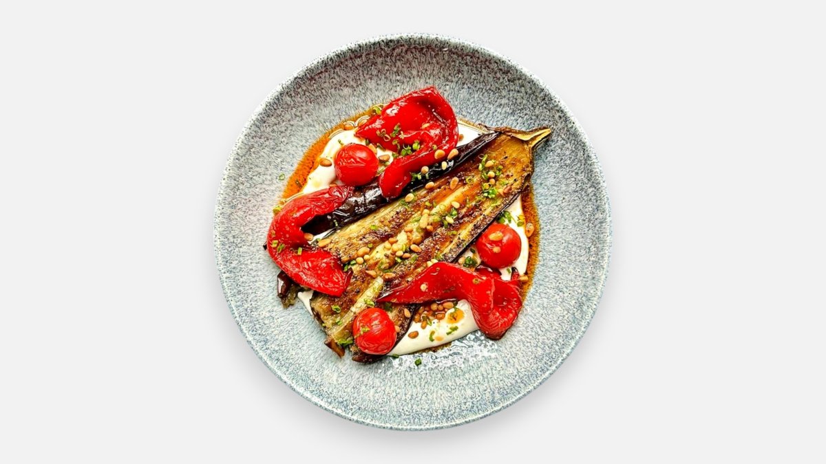 Paahdettua munakoisoa, suippopaprikaa ja pehmeää fetaa. Pinaattia, rucolaa, sydänsalaattia, granaattiomenansiemeniä, pinjansiemeniä ja chiliöljyä