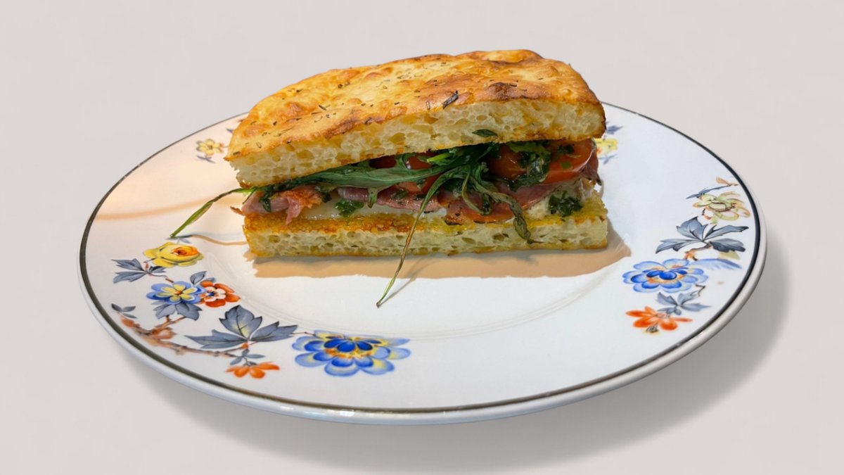Kuohkean rapeaksi pariloitu focaccia täytteenään Holmbergin aito maalaispalvi, Lentävän Lehmän Gryuere-juusto, tomaatti, rucola, dijon, majoneesi ja yrttiöljy.
