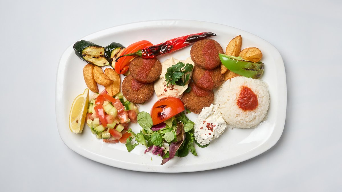 Kikherneistä valmistettuja kasvispyöryköitä, riisiä, perunaa, humusta sekä tomaatti- ja jogurttikastiketta (G, K)