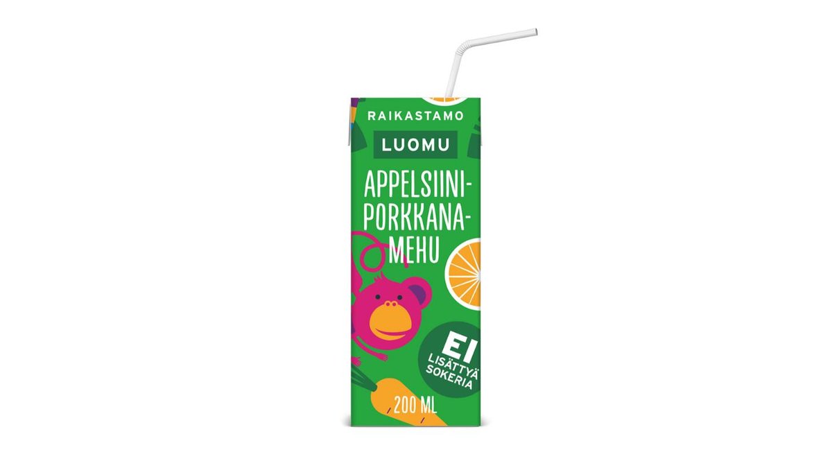 Raikastamon luomu appelsiini-porkkana pillimehu on raikas juoma, jossa ei ole lainkaan lisättyä sokeria. Mehu on virkistävä välipala ja helppo ottaa mukaan retkille ja leikkipuistoon. Täysmehupitoisuus 90 %. Säilyy avaamattomana huoneenlämmössä. LUOMU