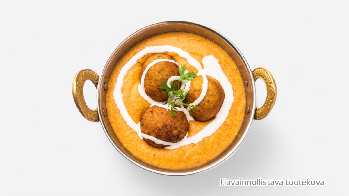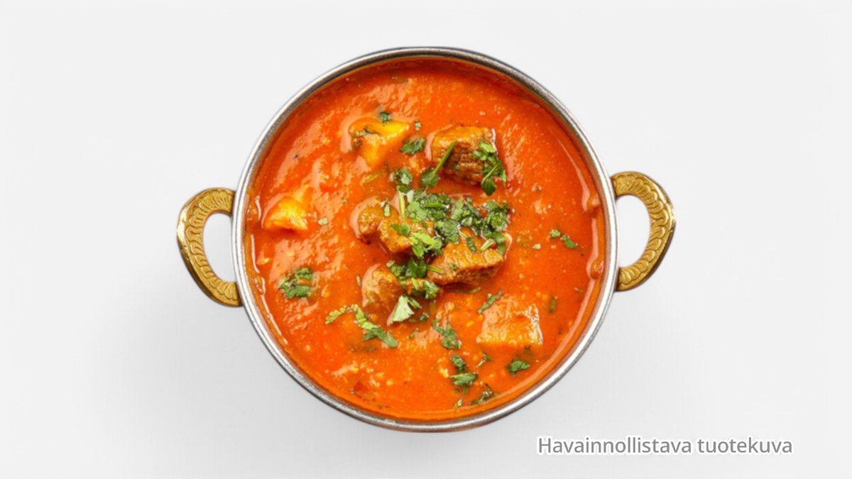 Kaksi annosta. Yrtti-jogurttimarinituja ja tandoori-uunissa grillattuja kananrintafilepaloja,sipulia, tomaattia, kerma, masalakastikkeessa.. Sisältää myös: 2 Riisi, 2 Naanleipä ja 2 Raita