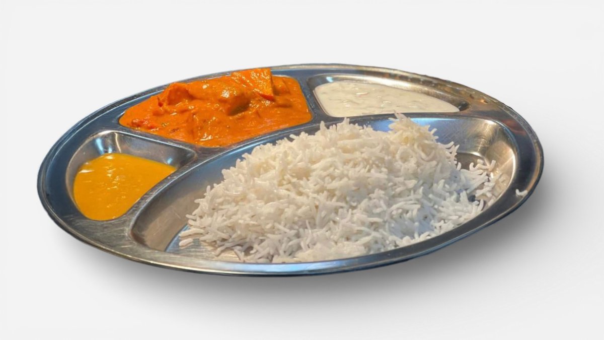 Each main course includes naan bread, basmati rice, raitaa
