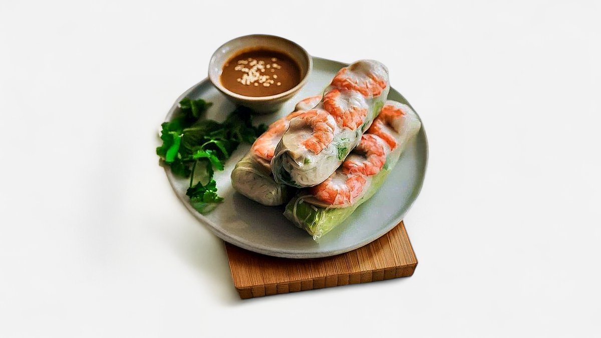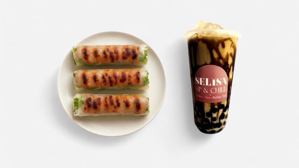 Grilled Pork Sausage Spring Rolls (2PCS): Rice paper, Fresh vegetables, cucumber, grilled pork sausage. 1 M size Brown Sugar Bubble Milk Tea