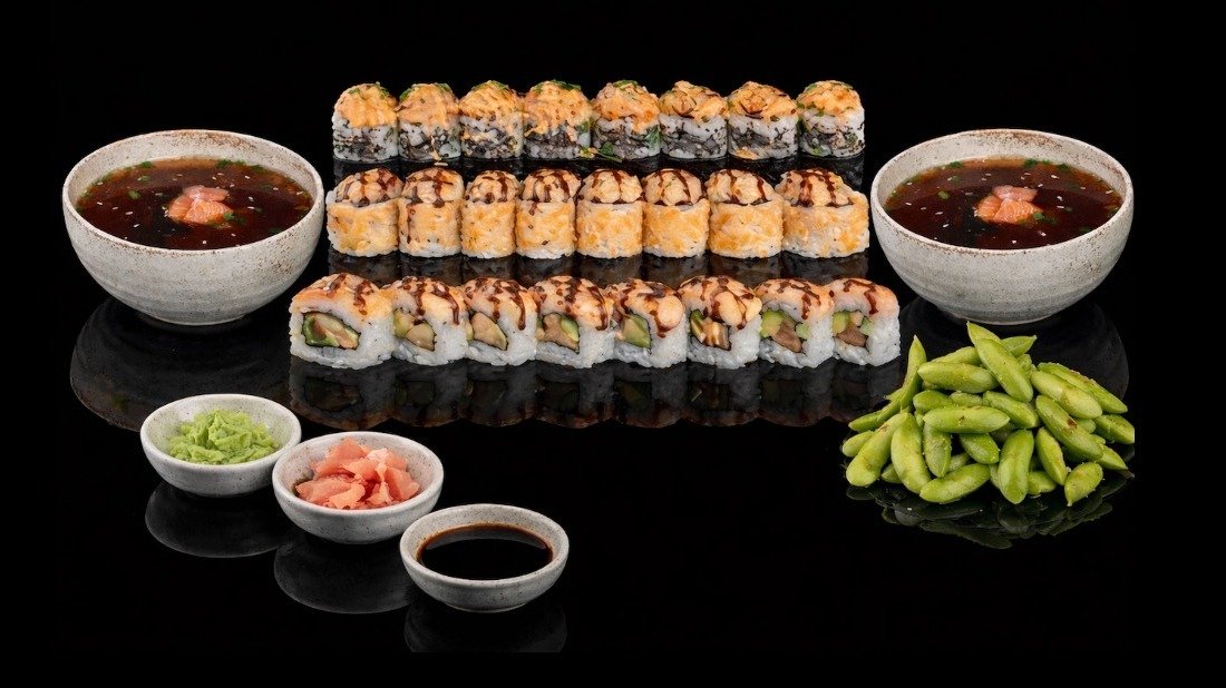 8kpl Venetsia maki 8kpl Milano maki 8kpl Malta maki 8kpl Malaga maki 3kpl Musubi Tofu Nigiri 3kpl Inari Tofu Nigiri 3kpl Avocado Nigiri
