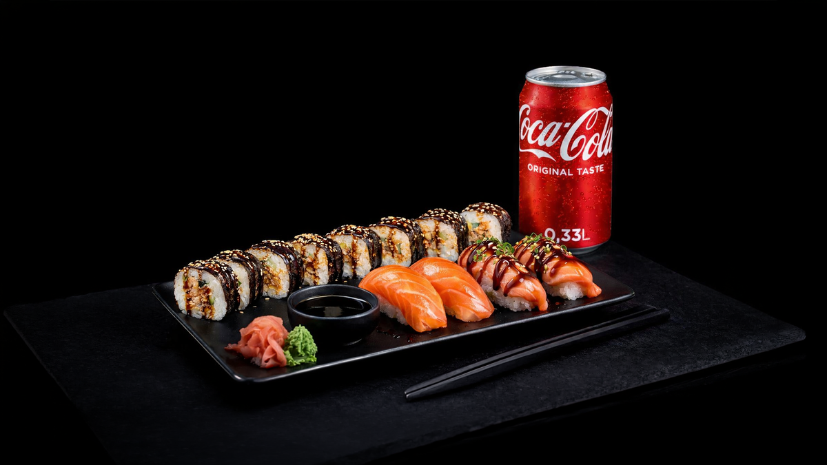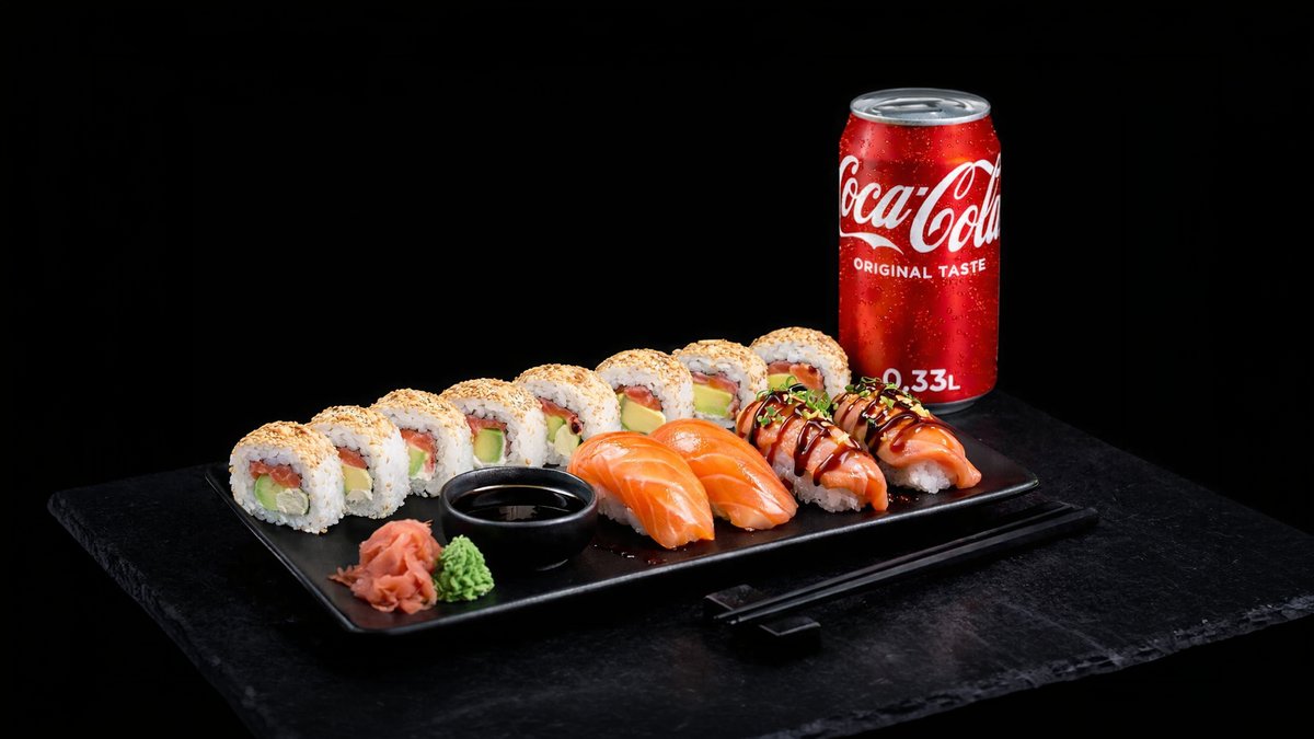 8kpl Philadelphia maki 2kpl Halstrattu lohi nigiri 2kpl Shake nigiri 1kpl Juoma
