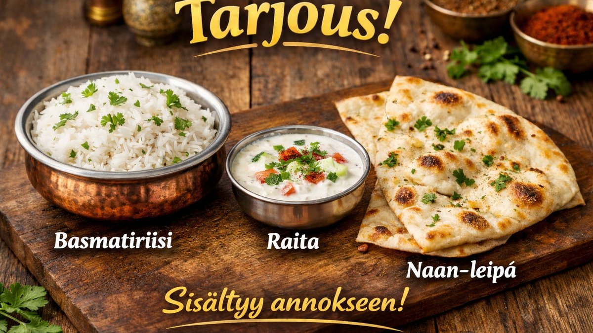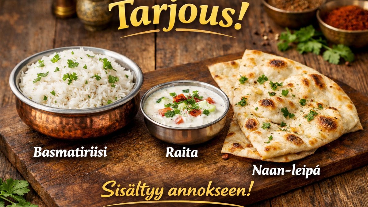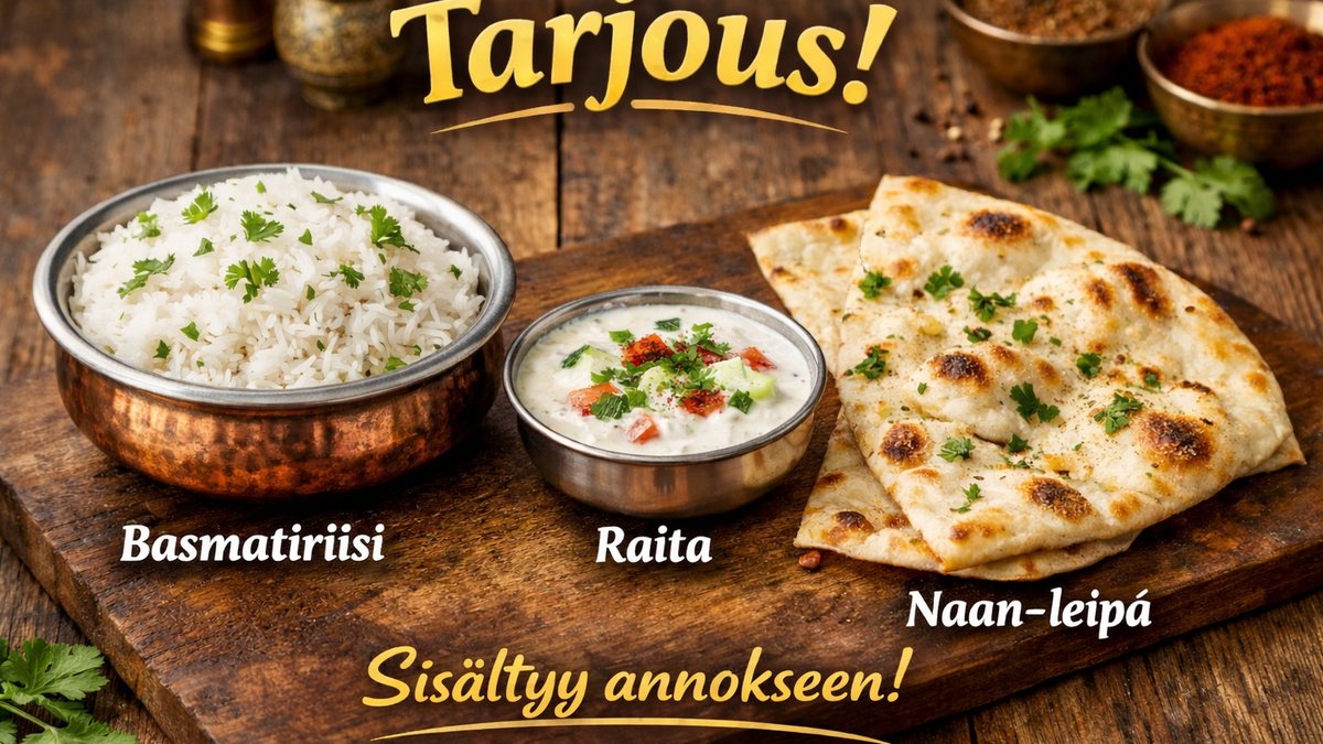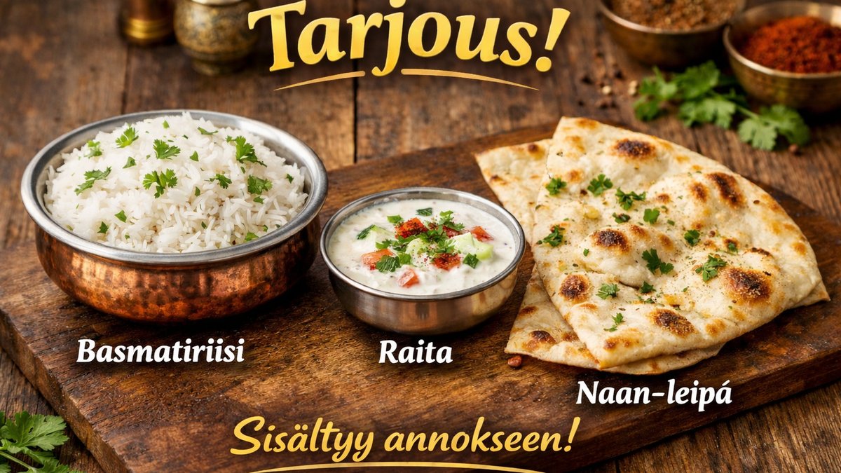 Annokseen sisältyy basmatiriisi, raita ja naan-leipä.