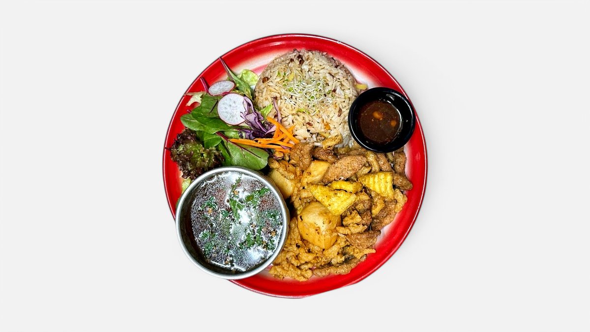 Fried rice with protein and mixed veggies, garlic, dark soy sauce, tomato. Protein choices: mixed protein, Beyond Meat, tofu, “red pork” (roast “pork” made from texturized soy protein), texturized pea protein, texturized soy protein, texturized dark soy protein, not really 'pork belly'. Allergens: soy / pea.