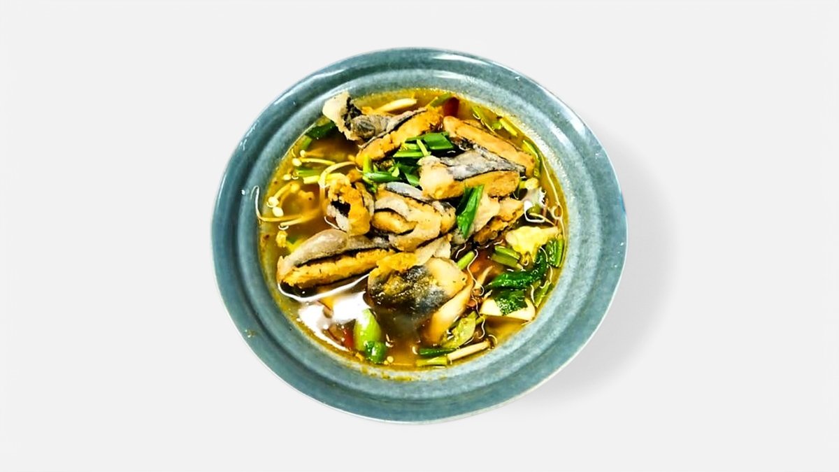 Vegan 'fish' in hot and sour lemongrass soup. Mixed veggies and coriander. Comes with rice.