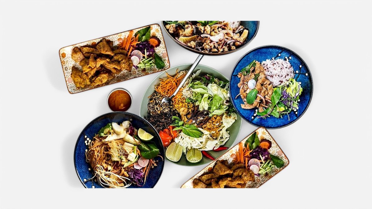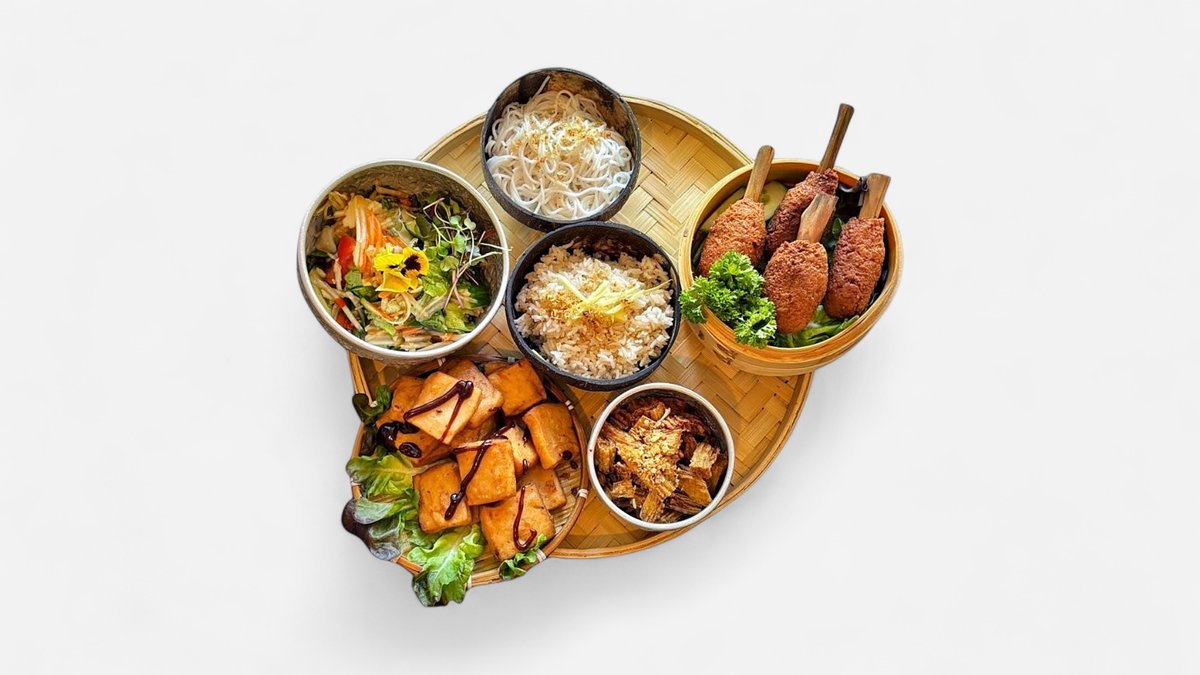 Som Tam Tray A bold and refreshing Thai raw spicy salad made with garlic, mixed vegetables, chili, tamarind, lime, and tomato. This abundant tray includes: 🍚 Garlic rice – fragrant jasmine rice stir-fried with crispy garlic 🍜 Rice noodles 🌱 Homemade chickpea tofu 🍢 Deep-fried bean curd with garlic & pepper 🌿 Lemongrass vegan chicken – made from Hernis, chickpea, soy sauce, tapioca, and herbal chili paste ✨ Comes with 3 house-made dipping sauces for extra flavor Allergens: 🌱 Contains soy, chickpea