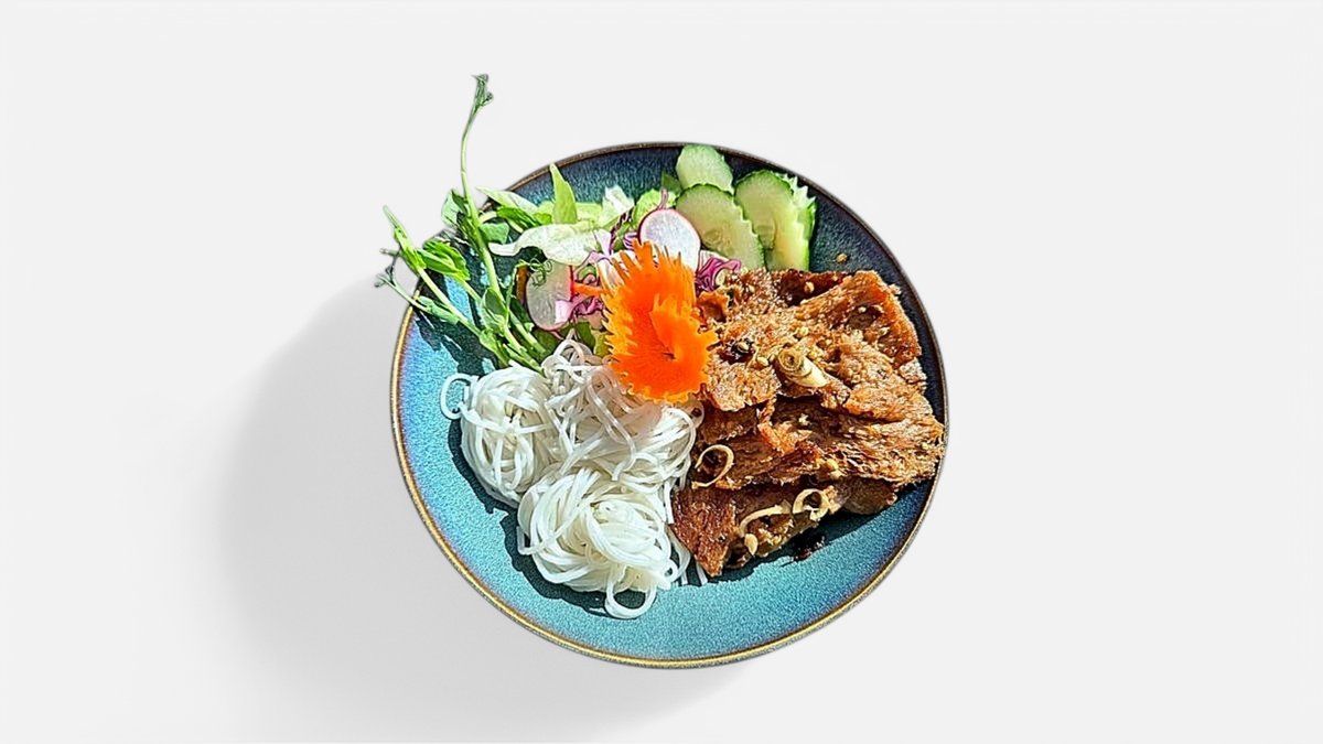 Vietnamese grilled 'beef' salad with soy, rice noodles, salad, garlic, chilli and herbs.
