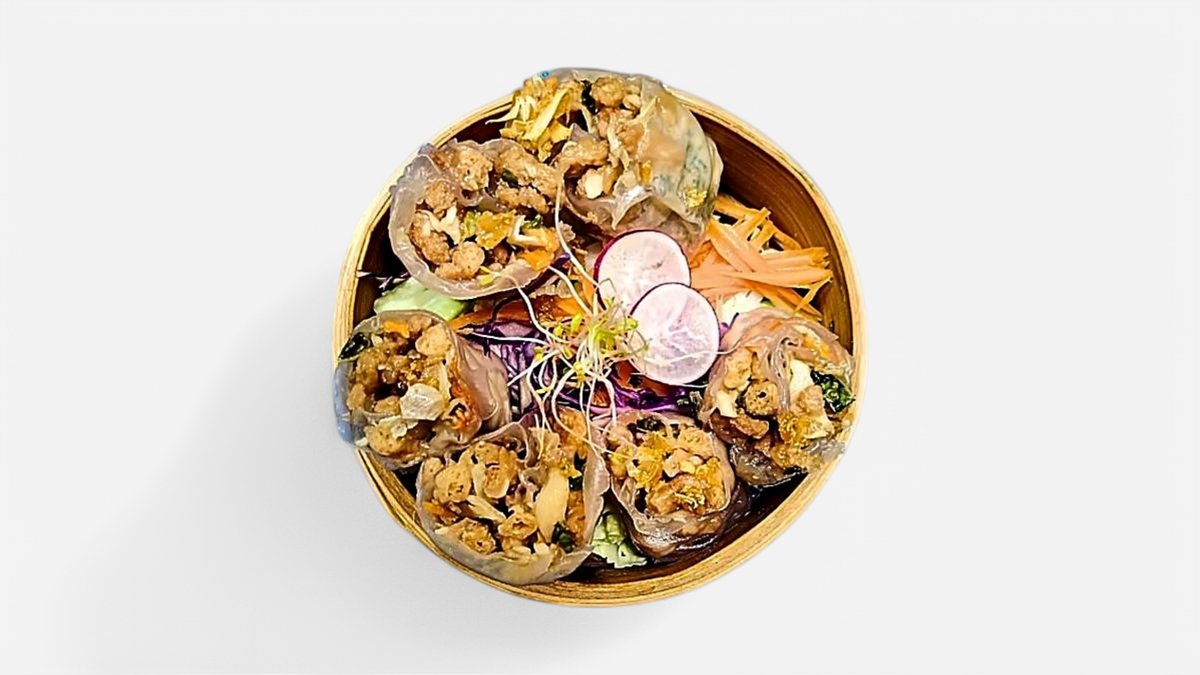 Steam pea protein texture in rice paper, sesame, carrot, mushroom, garlic and dip.