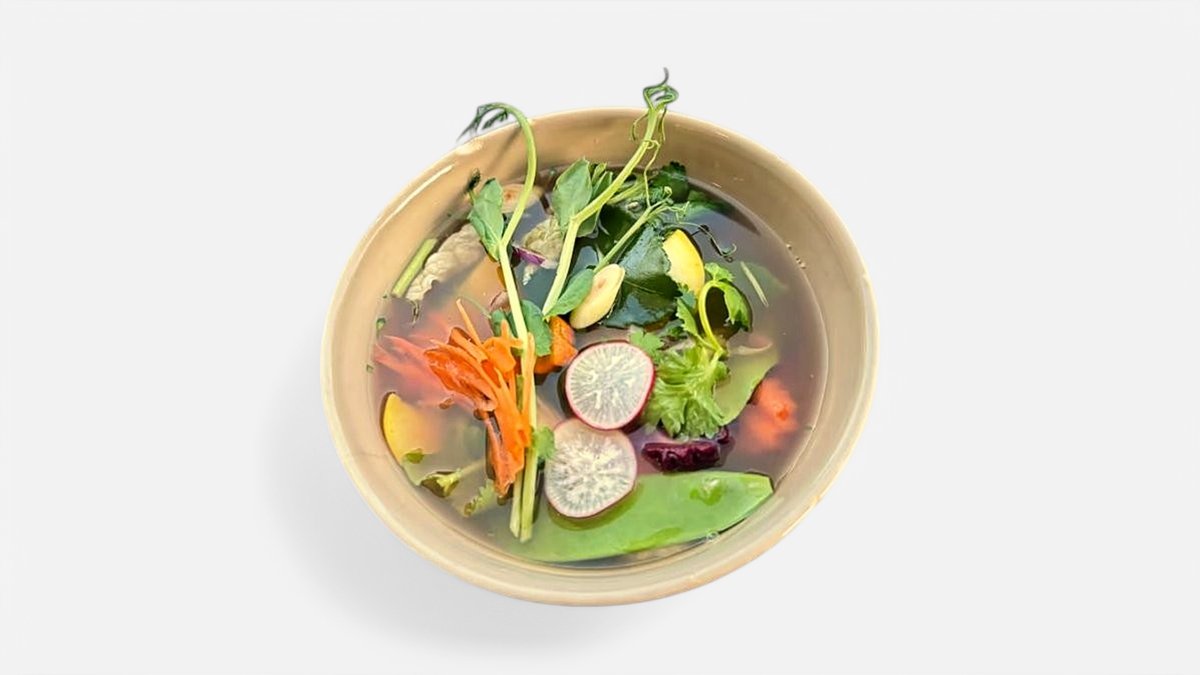 Hot & sour veggies soup with galangal, lime leaves lemongrass, coriander, lime, tamarind and chili.