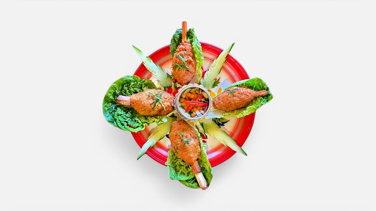 Deep fried in style of Thai Vegan chicken leg lemongrass, made from chickpea, pea texture, rice and tapioca flour, homemade chili paste ( chili, garlic, lime leaves, lemongrass, galangal, onion, turmeric), oil, coconut.