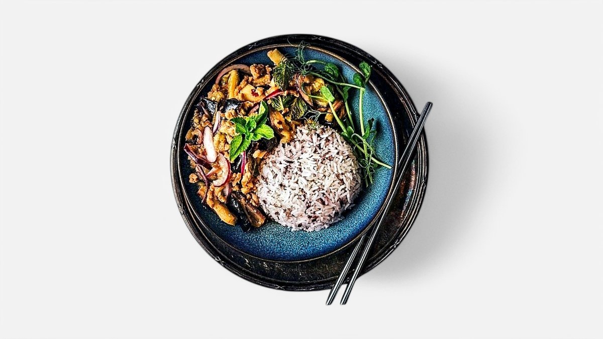 Fried rice with Northern Thai-style spicy herbaceous pea protein, garlic, chili, kaffir lime leaf, lemongrass, galangal, turmeric. Spicy. Allergens: pea