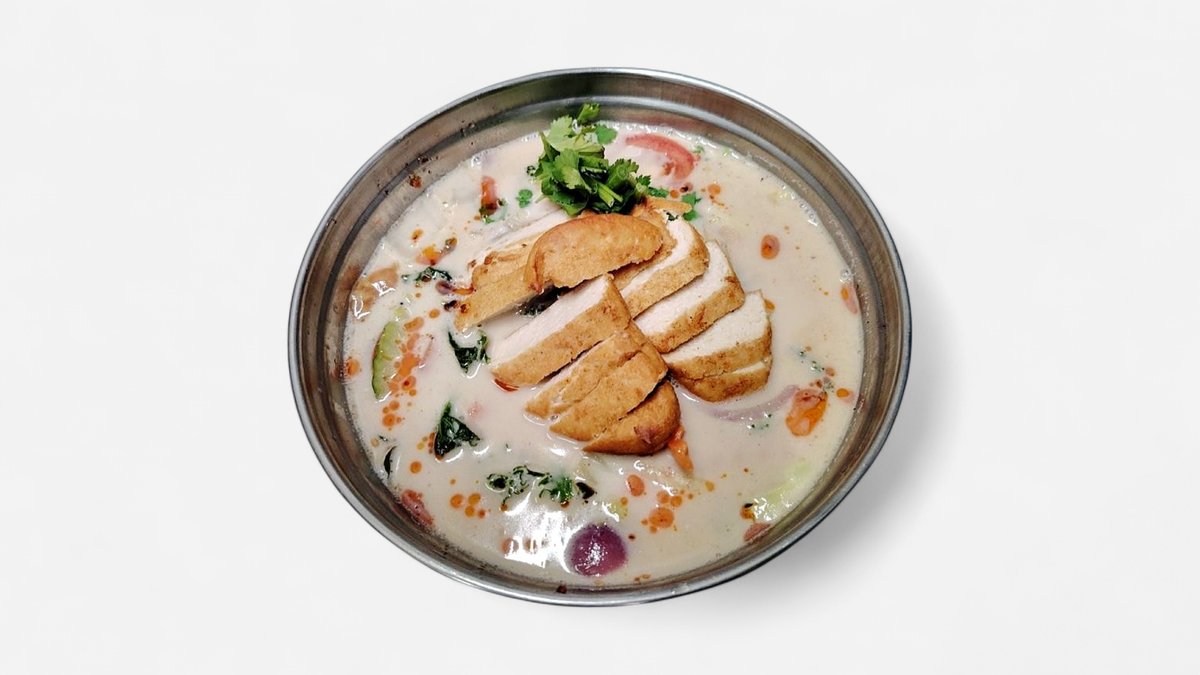 rich and creamy coconut milk base, balanced with the tangy flavor of fresh lime juice, the spiciness of chili, and the fragrance of l emongrass, kaffir lime leaves, and galangal.( Onion, tamarind, mixed vegetables). Served with rice.
