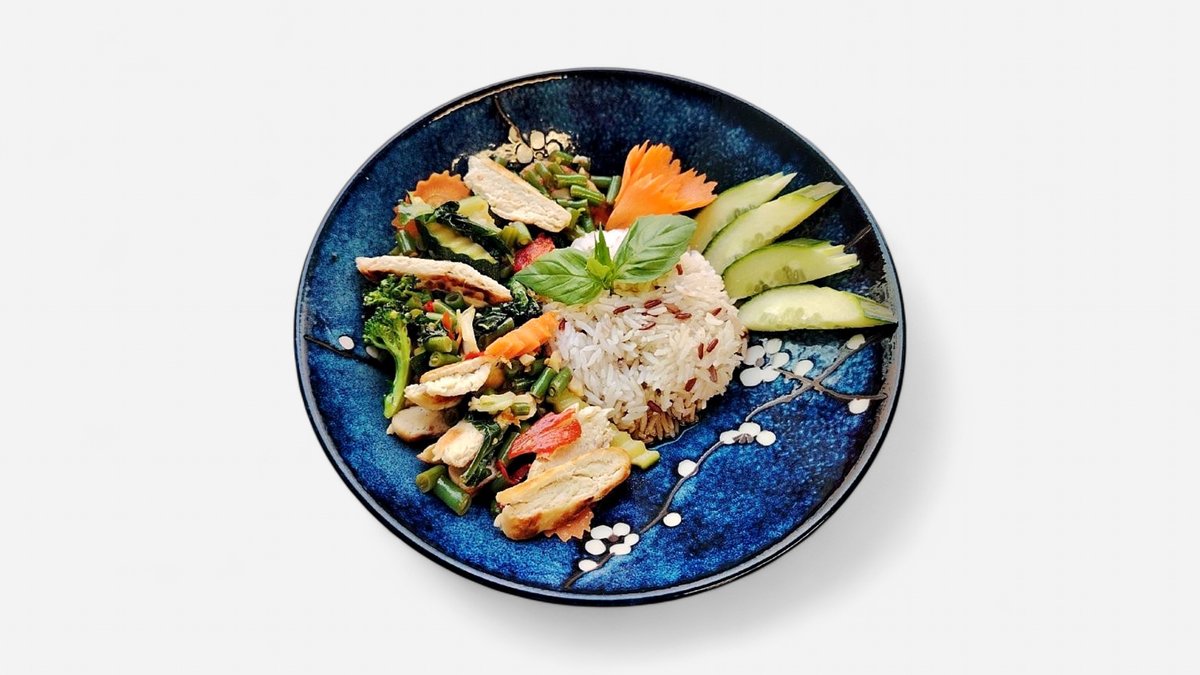 Stir-fried vegan chicken with garlic, chili, Thai holy basil, and mixed vegetables in a savory soy and mushroom sauce Served with steamed jasmine rice A beloved Thai street food favorite .
