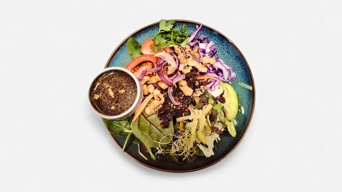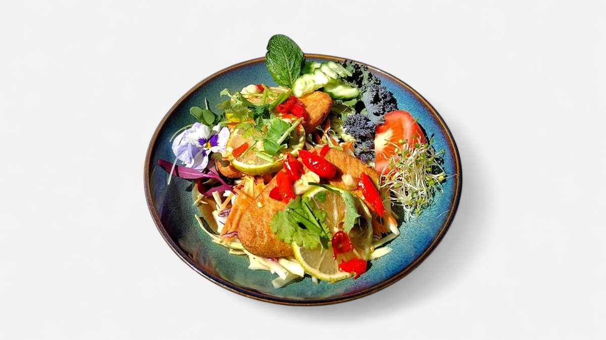 Deep fried vegan 'fish' comes with fresh salad, herbs, vermicelli noodles, chili, tahini and garlic dip. Medium Spicy. One bite: put salad leave, add the ingredients and dip on top and roll them together for a delicious bite! Vegan fish from: pea, chickpea, rice, tapioca, vegan fish sauce, nutritional yeast, seaweed.