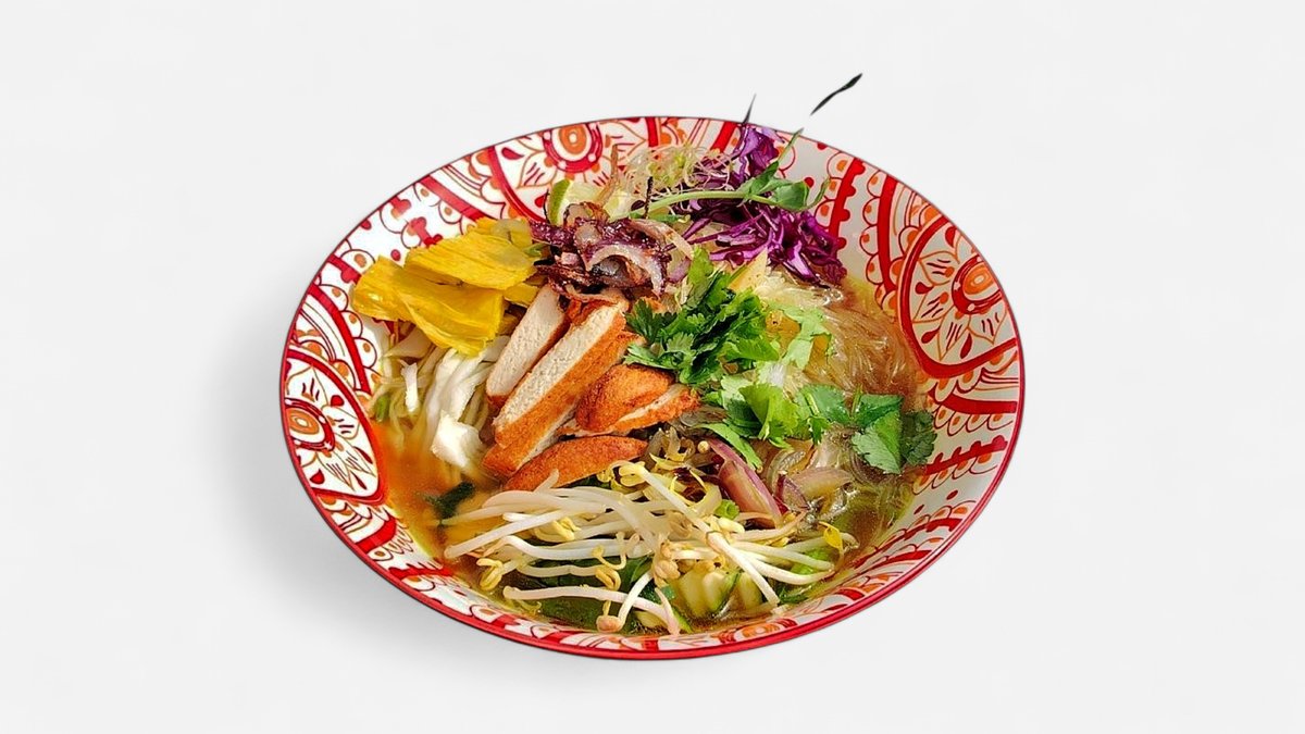 Vietnamese noodle soup,with mixed protein or protein of your choice onion, herbs, five spices, garlic, mixed vegetables, lime. Allergens: soy /pea/ chickpea