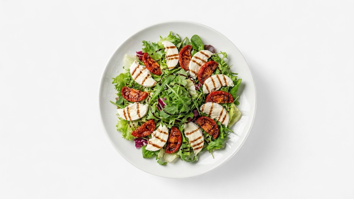 Salaattia, rucolaa, puolikuivattua tomattia, mozzarellaa ja balsamicokastiketta