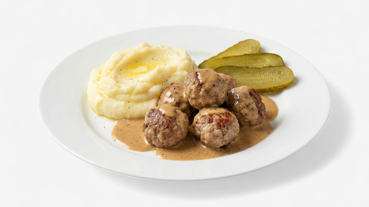 Itse tehdyt lihapullat naudanlihasta (Suomi), pippurikastiketta ja perunamuusia sekä suolakurkkua