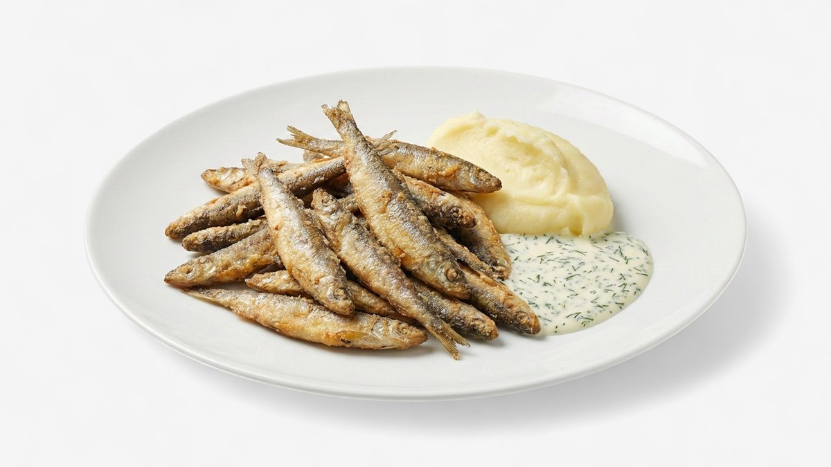 Ruisjauhoissa pyöriteltyjä ja voissa paistettuja muikkuja, perunamuusia ja tilli-kermaviilikastiketta