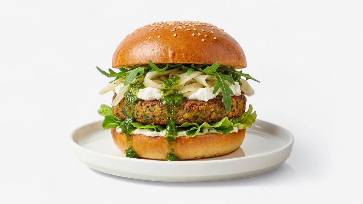 Kasvispihvi, vegaanista “vuohenjuustoa”, salaattia, rucolaa, marinoitua fenkolia, salsa verde -kastiketta ja ranskalaisia