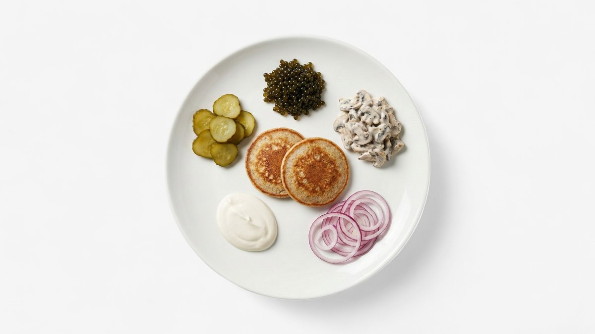 Kaksi bliniä ja Suolakurkkuja, merilevä ”mätiä”, sienisalaattia, punasipulia ja vegaanista hapankermaa