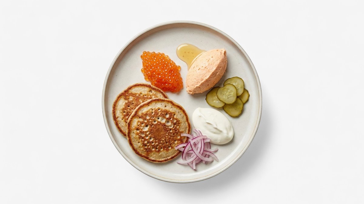 Kaksi bliniä ja Suomalaista muikunmätiä, suolakurkkuja, hunajaa, savulohimoussea, punasipulia ja smetanaa