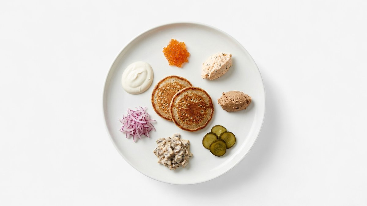 Kaksi bliniä ja Suomalaista muikunmätiä, savulohimoussea, Myrttisen suolakurkkuja, sienisalaattia, savuporomoussea, punasipulia ja smetanaa