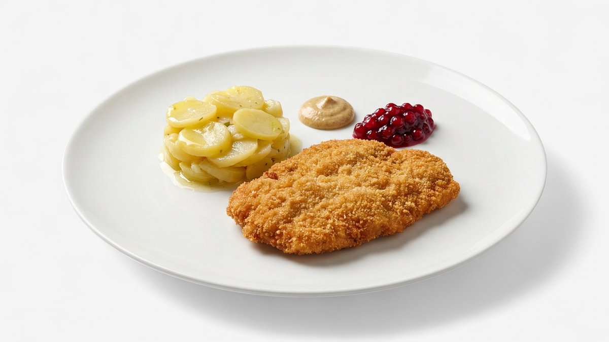 120 g leivitettyä porsaan leikettä (Suomi), kirkasta perunasalaattia, piparjuurisinappia ja puolukkasurvosta