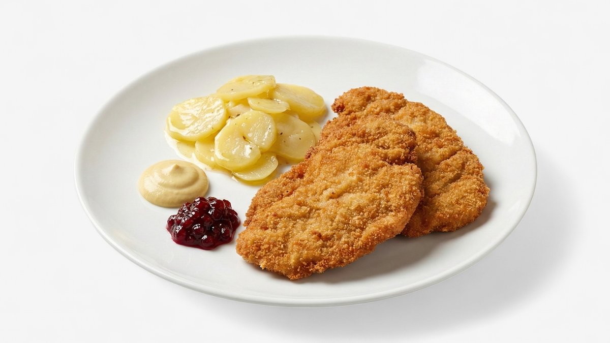2 kpl 120 g leivitettyä porsaan leikettä (Suomi), kirkasta perunasalaattia, piparjuurisinappia ja puolukkasurvosta