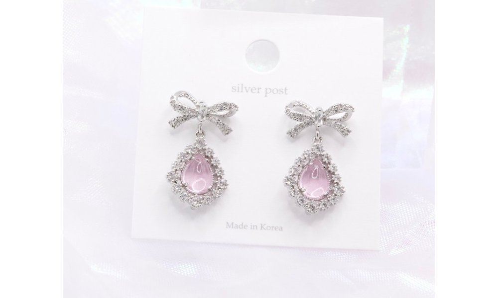 Cute Pink Pastel Ribbon Waterdrop Stone Korean Stud Earrings